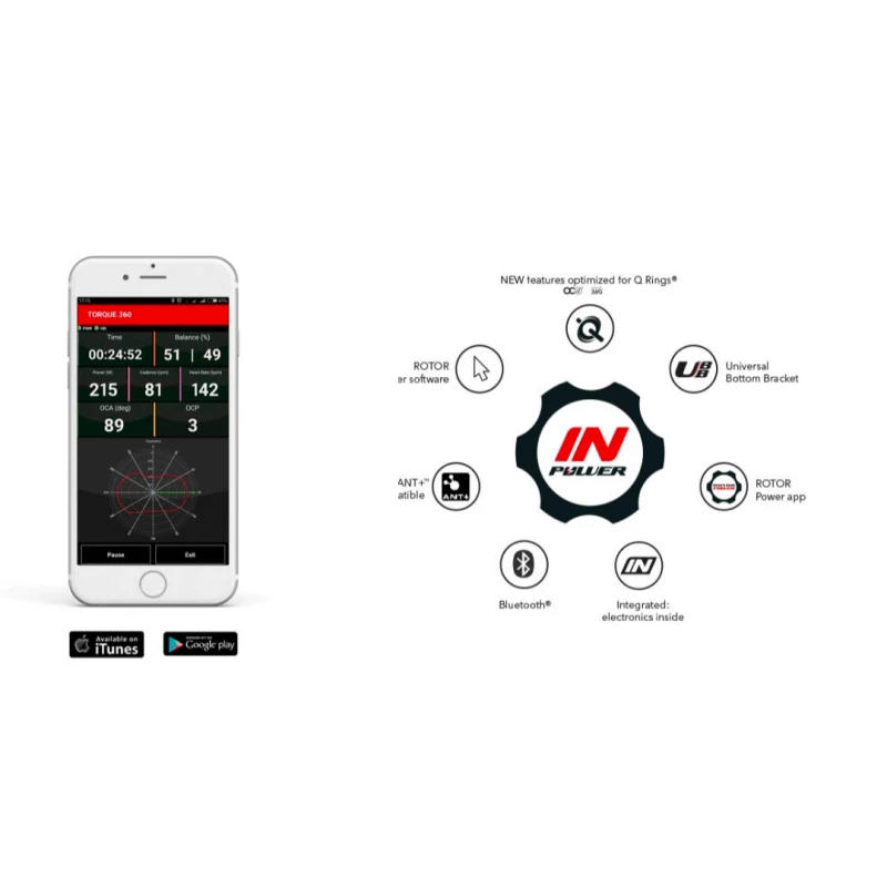 Transmisión de datos: potencia, cadencia, equilibrio, efectividad de par y suavidad del pedal en cada pierna a través del protocolo estándar ANT + ™ y Bluetooth® Smart. Análisis de pedaleo L / R independiente o combinado utilizando el ángulo óptimo de plato (OCA) y las mediciones TORQUE 360 en el entorno de software del usuario y la aplicación ROTOR Power para móviles.