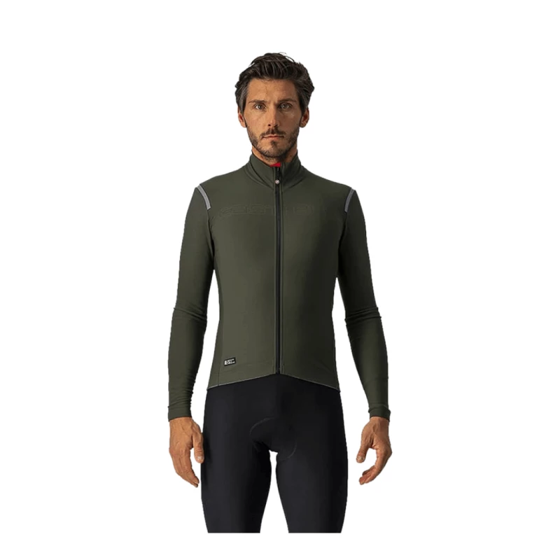 El tejido Nano Flex 3G presenta un cálido tejido polar peinado en la parte interior, con el 20 % de elastano para ofrecer elasticidad, y el tratamiento repelente al agua Nano Flex, exclusivo de Castelli.